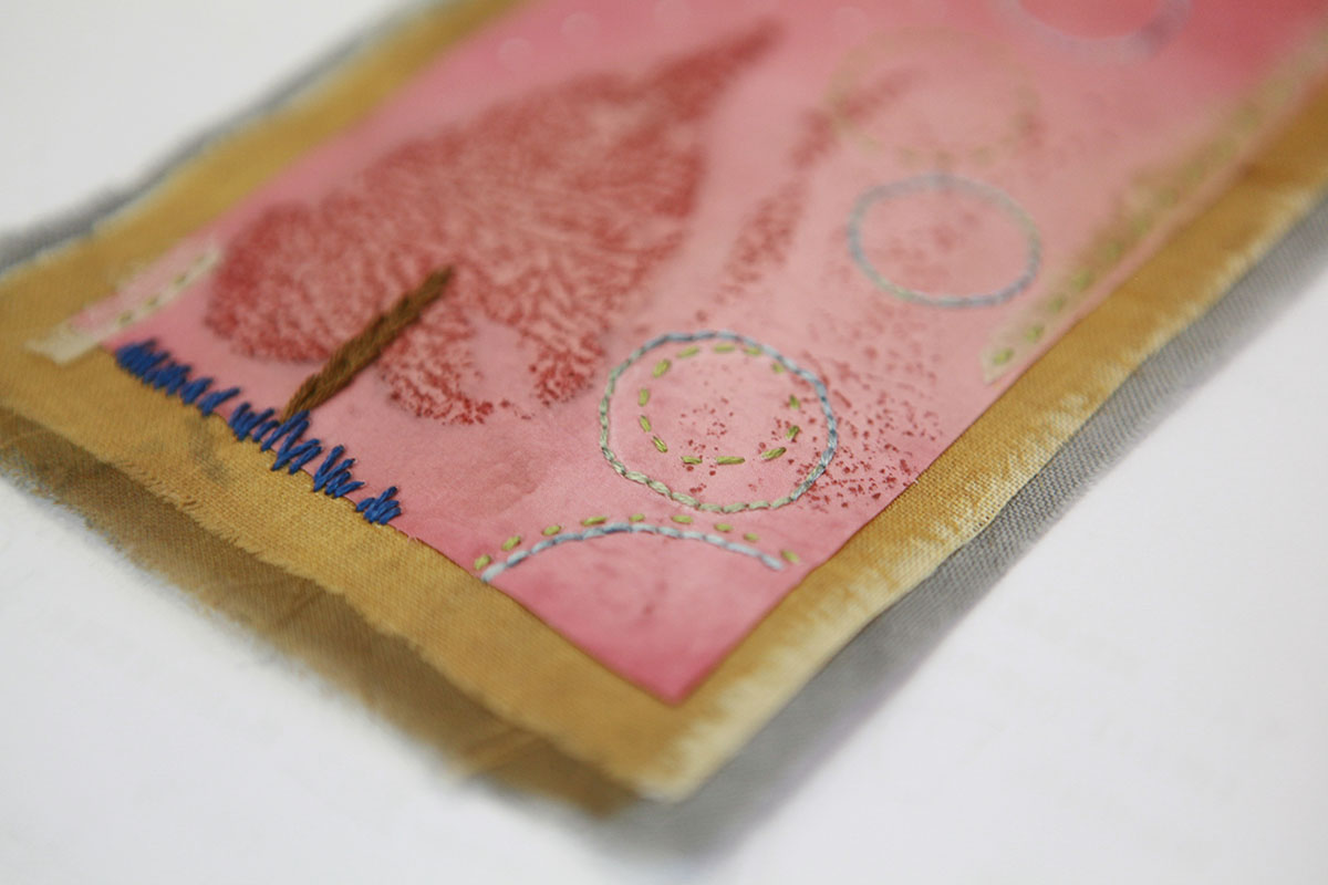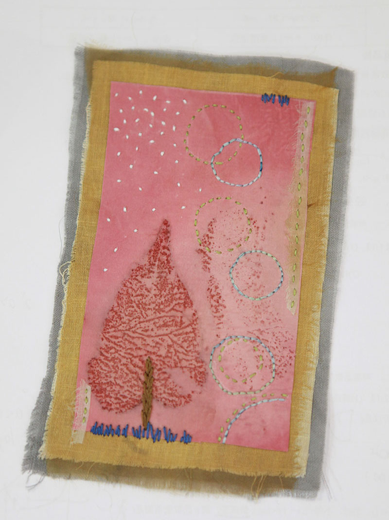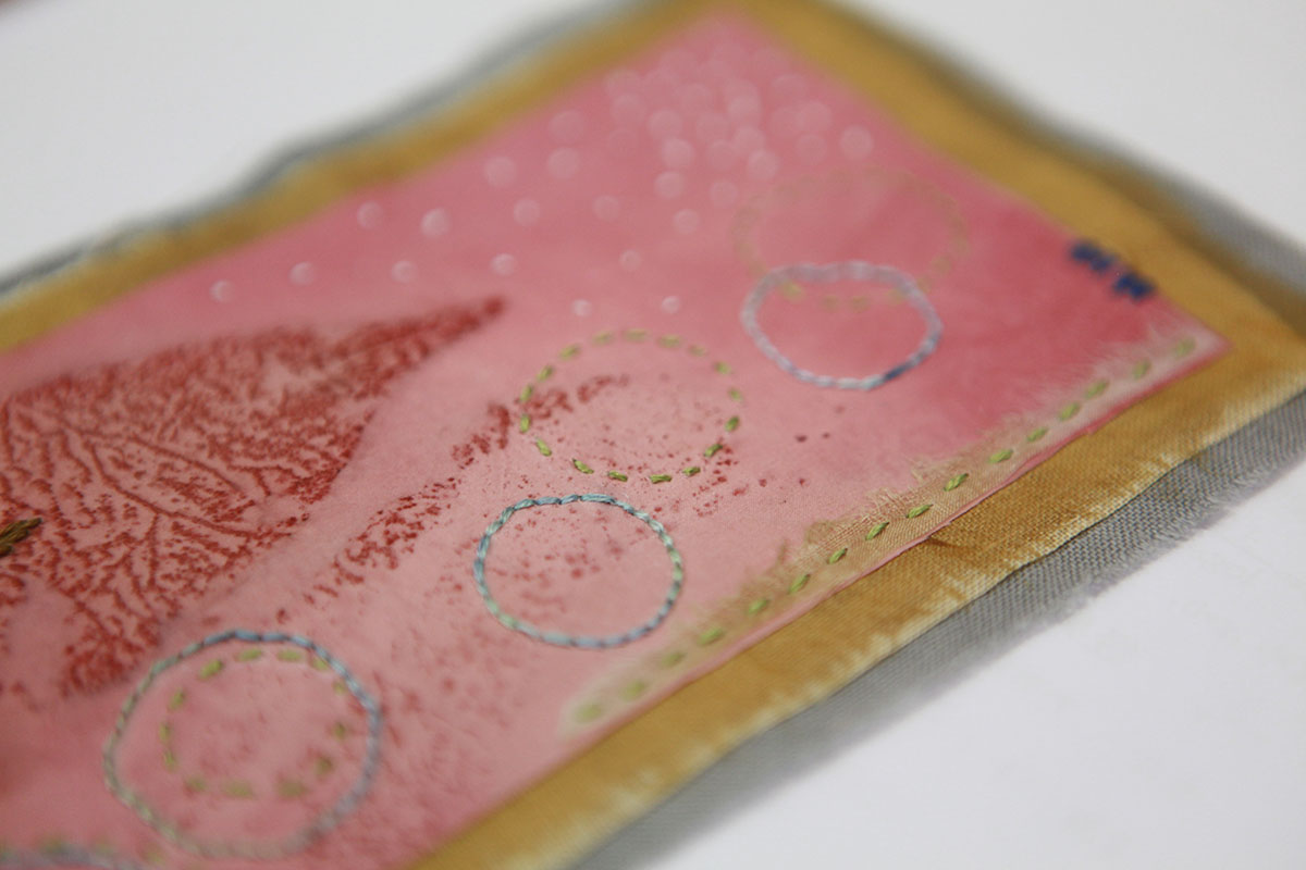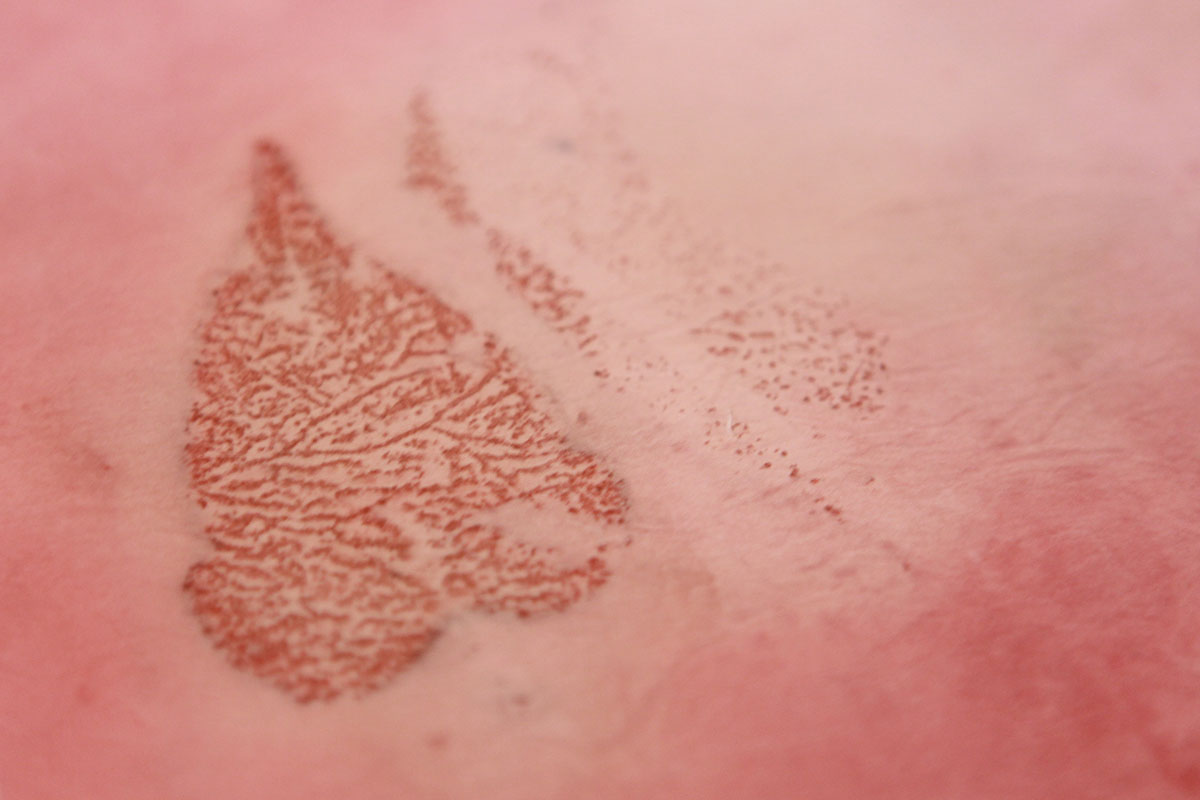 树叶的拓染,然后叠加苏木套染,形成第一层的胭粉。