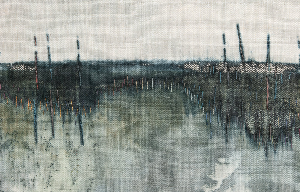 我对复制我的照片或制作精确的风景画不感兴趣。我想要的是把我感兴趣的元素带出来,玩玩,看看我能用它们做什么。我把照片打印出来,然后剪开。把它们分割开来,脱离背景,当我第一次拍这些照片时,那些吸引我眼球的线性元素变得更像shiborii。将它们排列成新的构图类似于我与布料的工作方式,有很多自由的方式来尝试并置不同的线条和色调。