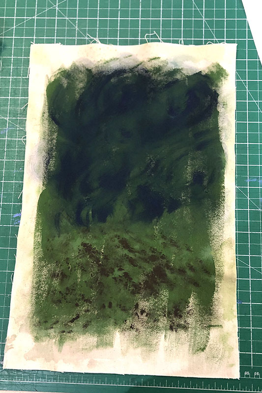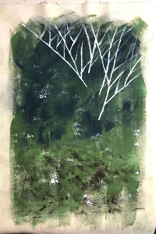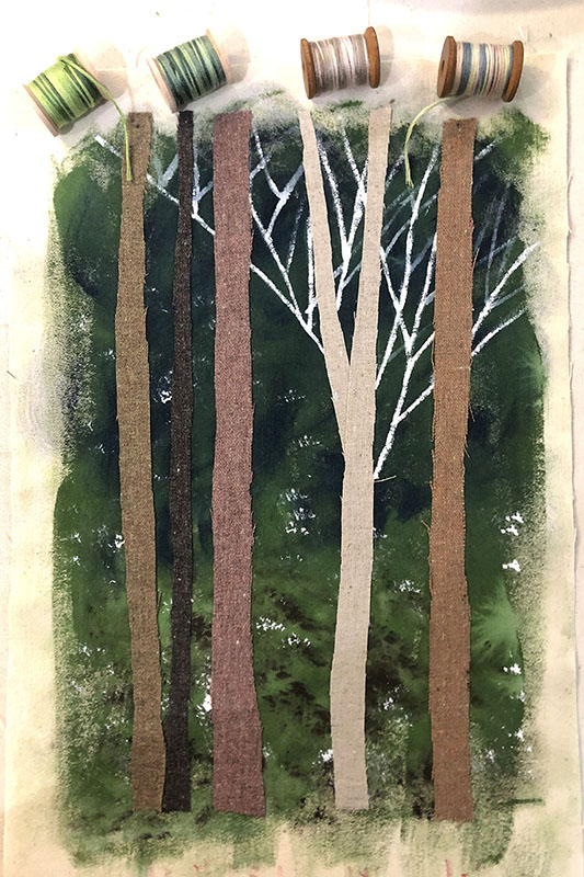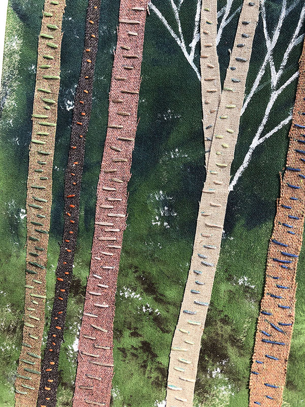 第三个树林实验,只做了树林,没有做小动物,不再童话色彩,是一个更偏爱的寂静的树林。用丙烯打底,先用橄榄绿,刷完觉得有些呆滞,趁着半干的时候,用普蓝晕染了天空,干了之后,用熟褐点染地面。然后画背景枝桠,画完还有白色颜料多,就星星点点了背景,发现白色点点效果还不错。最后用贴布刺绣做前景,段染绣线很中意,仿佛光斑。