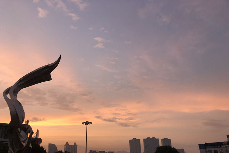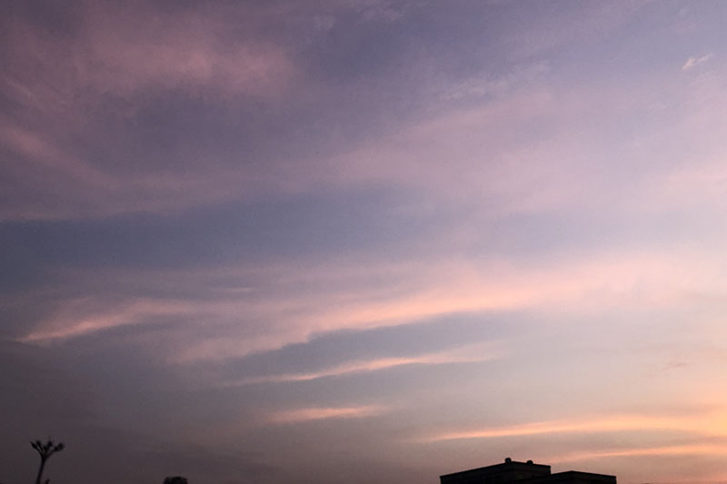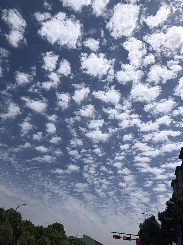 那日天气晴朗,云一小朵一小朵地铺满天空,这种云在江南很少见到。平日里,若是阴雨,常是深深浅浅的灰色云层层叠叠满铺着;若是晴天,总是丝丝缕缕半透明状扁平态的云居多;而在晴朗的暑夏,午后至傍晚期间,远处山顶会有大团大团的云朵缓慢升起,覆盖着一层热烈的阳光。