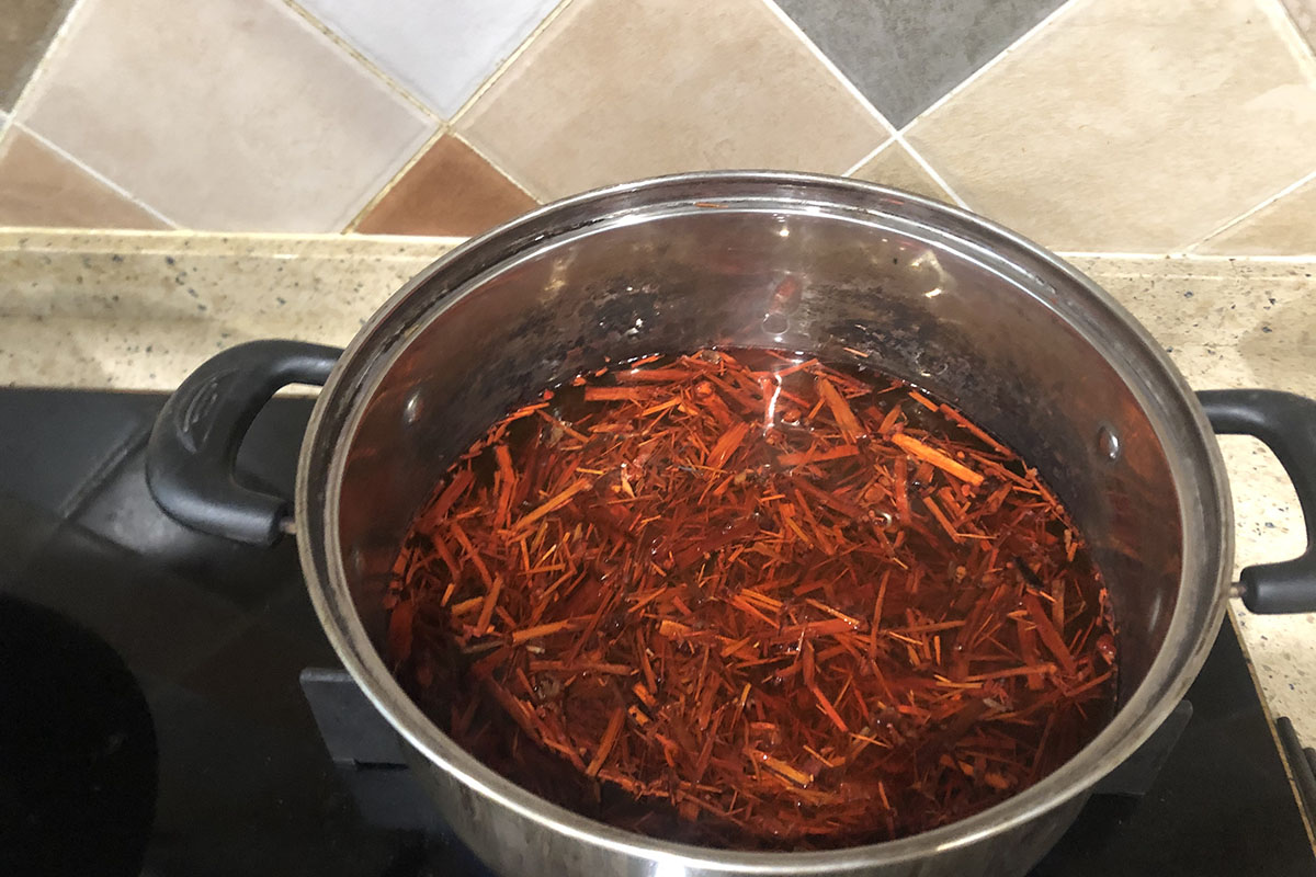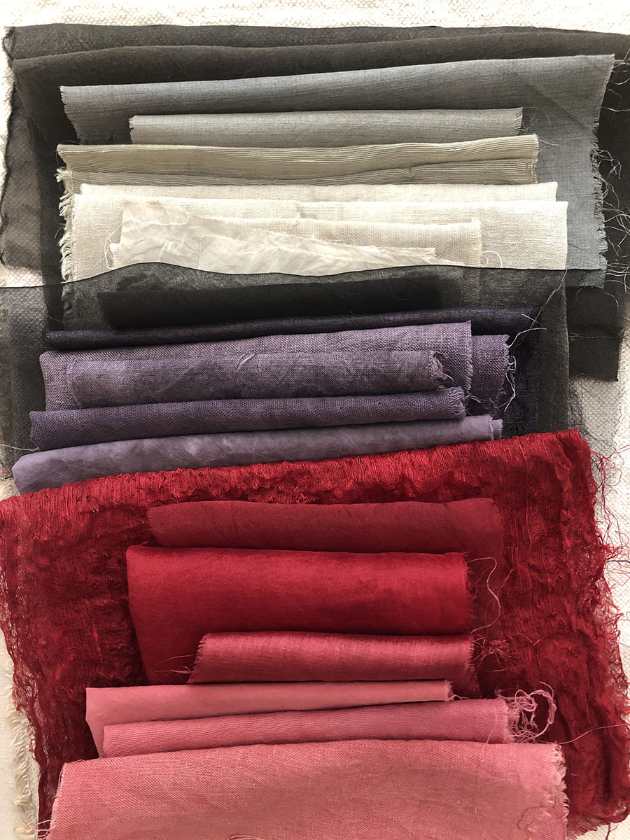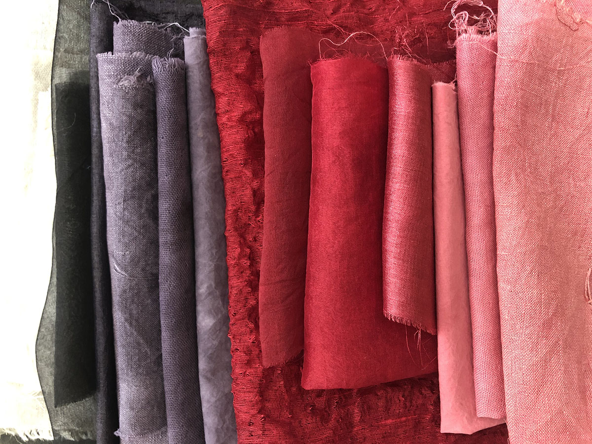 没想到材质本身的影响那么大。艾草是一锅煮出来的,棉与麻是浅浅的绿,而蚕桑丝和柞蚕丝是接近咖啡色的绿。蚕丝与麻混纺的布料色泽也在其中间。动物蛋白纤维的上色性能非常好。而化纤基本不能在植物染料中上色。苏木也一样,从胭红到饱满浓郁的红,是同一锅里煮出来的。