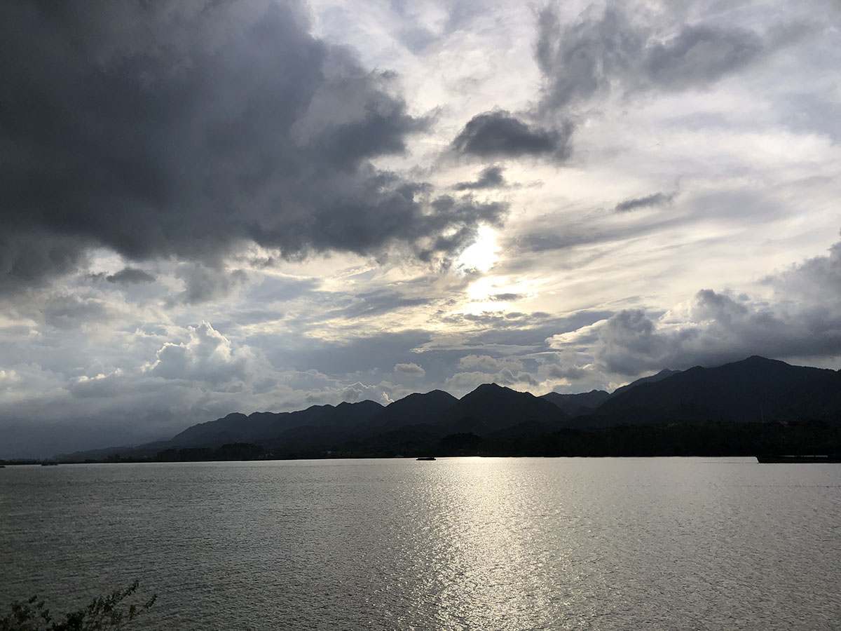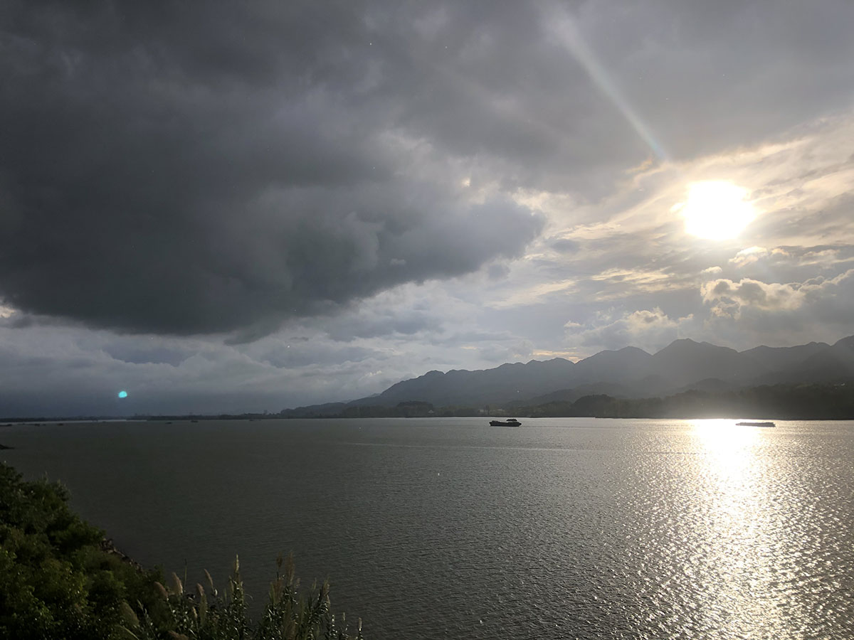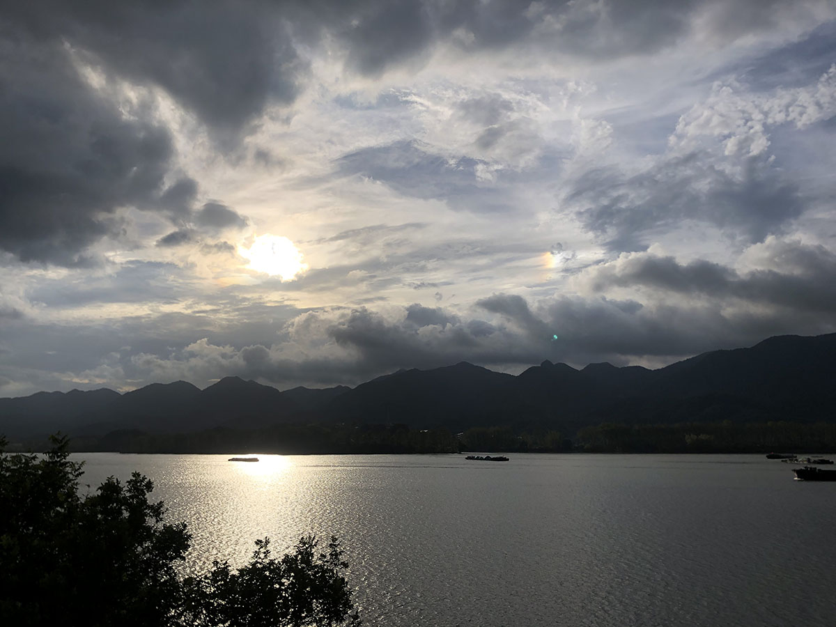 到杭州过了复兴大桥,暴雨停了,阳光照在某些云层上端,亮澄澄的金顶。在乌云的片断里,有玫瑰金色的晚霞和蓝色天空。大片铺陈着。