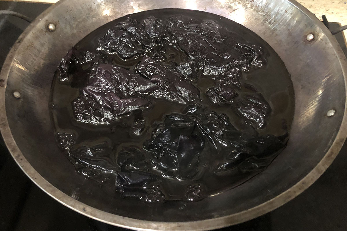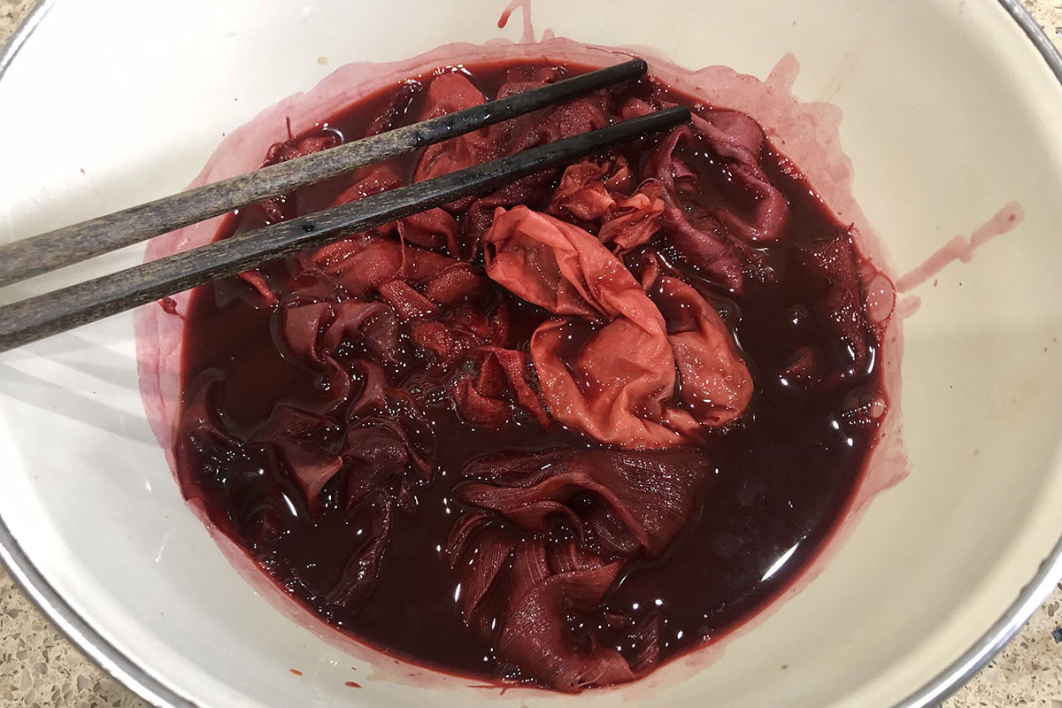 底是蓝染手织布。捡了两块蚕丝,艾草的绿,苏木的红,放在锅里煮出色,蚕丝的上色非常饱满。