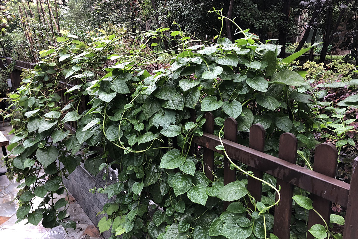 藤蔓植物真的很可怕呀。看起来柔柔弱弱,嫩嫩的,人蓄无害的样子,自己站都站不直。但它们会悄悄在缠住大树小树以及灌木,尤其是小树和灌木,会被它彻底缠住,把全部的身体重量都挂在对方身上,把对方的头都摁下去压在下面,然后密密在覆盖其上,直至小树和灌木都没有生存空间。多年的大株玫瑰和野蔷薇竟然全被木耳菜压得不见天日。藤蔓植物太可怕了。