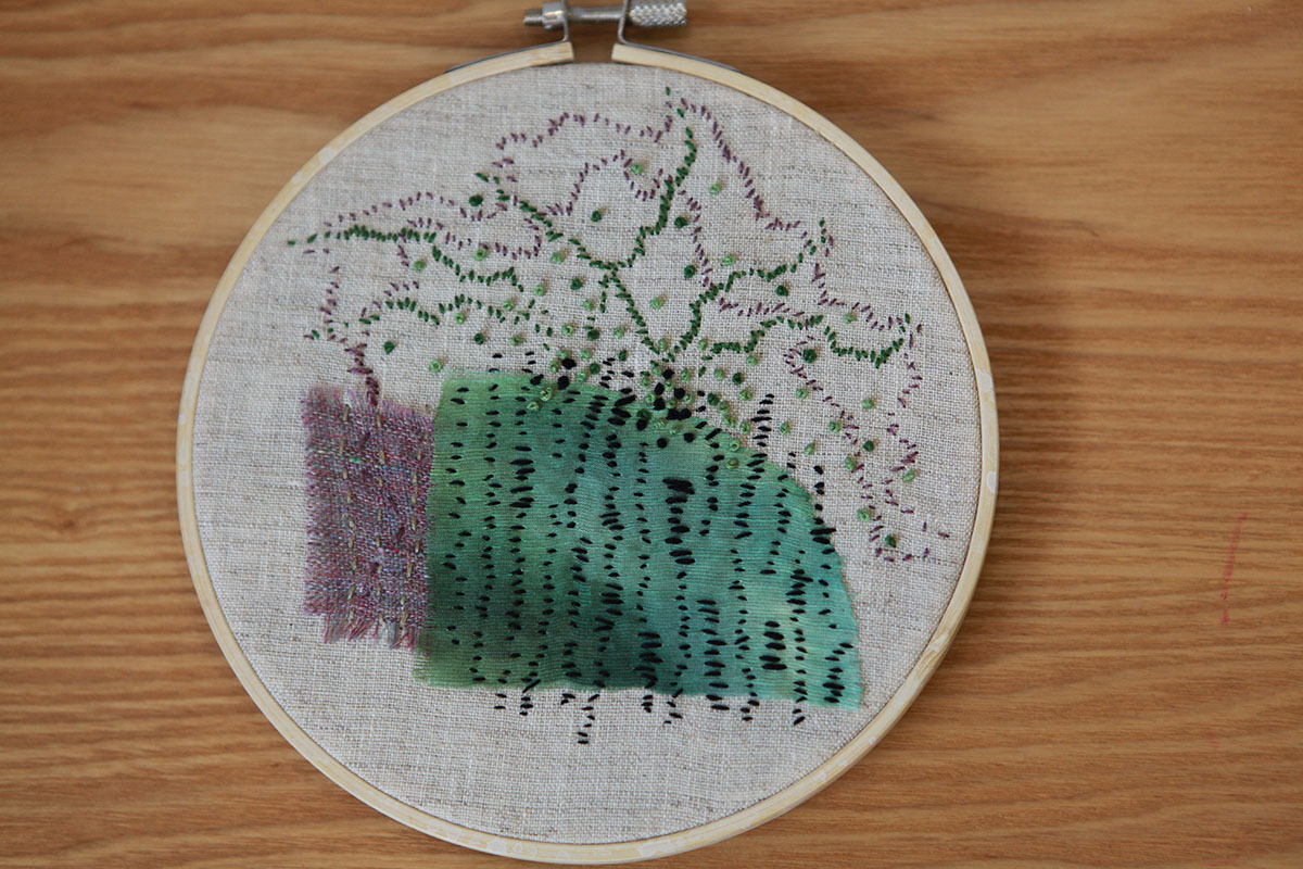 剪了即兴05里手工染色的深蓝绿色桑蚕丝布料绣绷外的一个小角,又捡了一块上次做茶席时剩下的深咖色小布块。开始第七个即兴缝合刺绣。