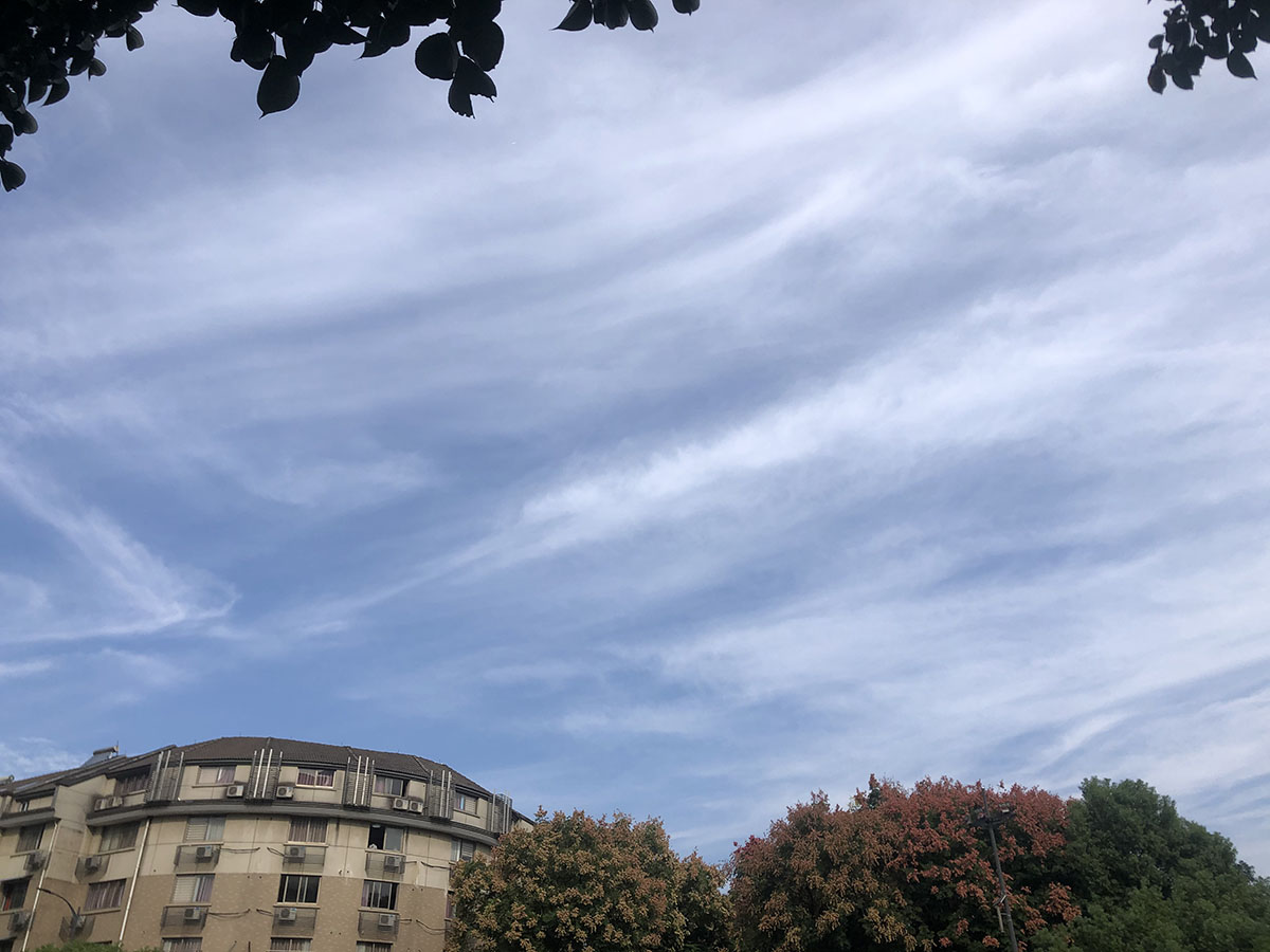 典型的江南天空和云,最常见的样子便是如此。淡淡的,薄薄的,如丝如缕,如雾如纱。尤其在秋季,天空又蓝又远。