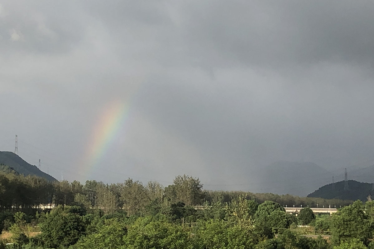 有蓝天清透,有乌云压顶。有太阳,有雨,然后一转身,越说:“看,有彩虹,还是落地的。彩虹落地有宝藏!”