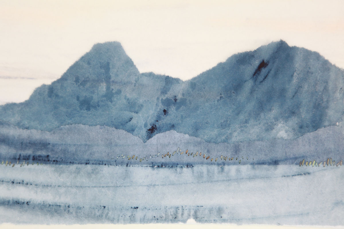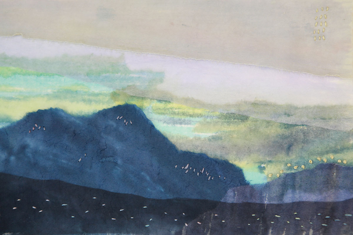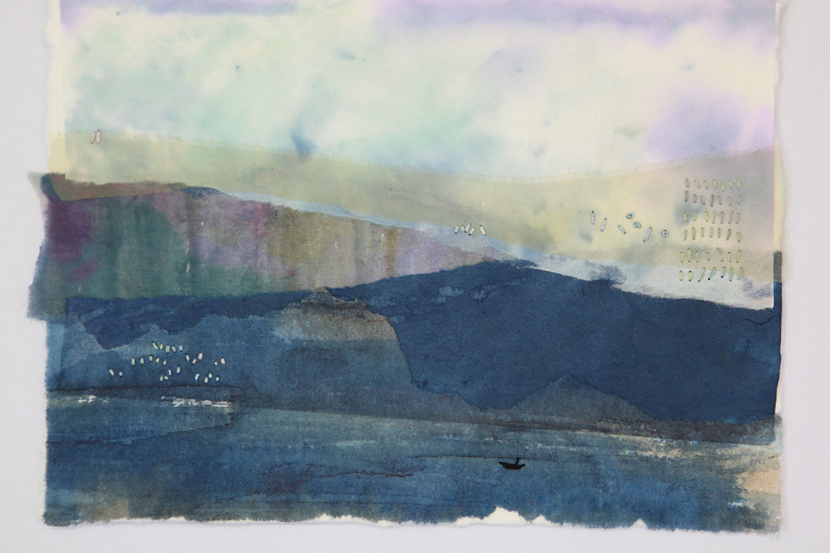 试试妮同学的《悦.鹭》。第一感觉是宁静的、空旷的、苍茫的、海天一色的、芦苇风起的。做了一些蓝色系,分为两组,第一组的三个沿用之前的路线,更倾向布艺拼贴缝制;第二组三个更倾面于中国山水,减少色彩,画面也更洁净些。“湖海上,一汀欧鹭,半帆烟雨”。