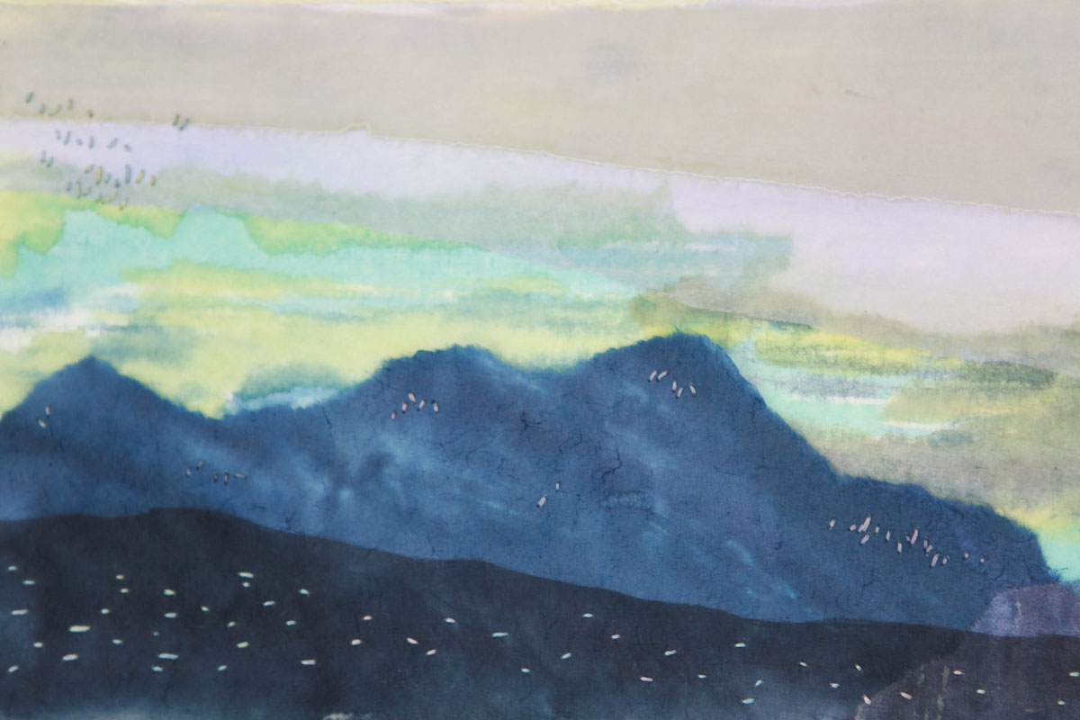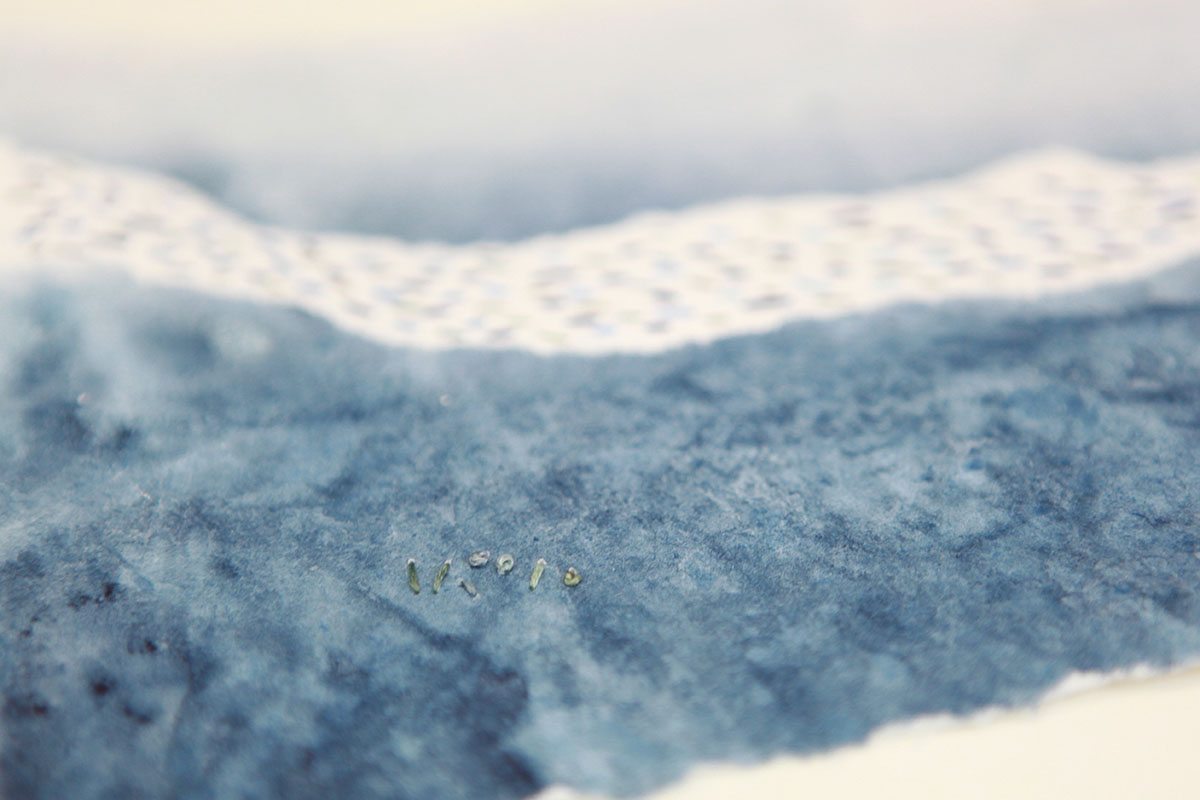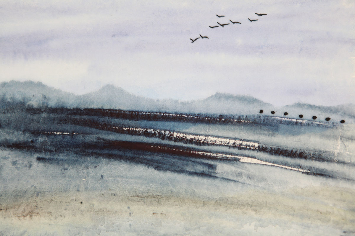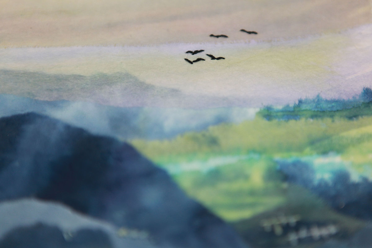 试试妮同学的《悦.鹭》。第一感觉是宁静的、空旷的、苍茫的、海天一色的、芦苇风起的。做了一些蓝色系,分为两组,第一组的三个沿用之前的路线,更倾向布艺拼贴缝制;第二组三个更倾面于中国山水,减少色彩,画面也更洁净些。“湖海上,一汀欧鹭,半帆烟雨”。